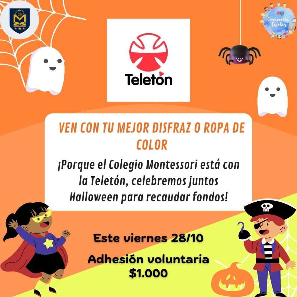 Porque el Colegio Montessori de Temuco está con la Teletón, te invitamos a asistir este viernes 28 de octubre con tu mejor disfraz, para celebrar Halloween y además recaudar fondos de forma entretenida para la campaña 2022… Para ello te solicitamos un aporte voluntario de $1.000 que irá en apoyo de los niños, niñas y jóvenes de la Teletón… ¡Te esperamos!