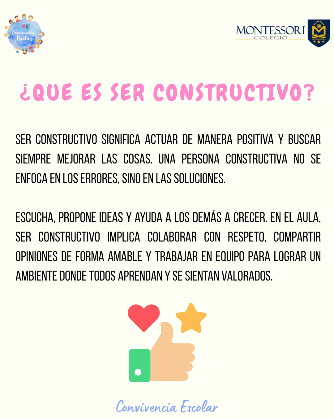Ser constructivo significa actuar de manera positiva y buscar siempre mejorar las cosas. Una persona constructiva no se enfoca en los errores, sino en las soluciones, ya que ser constructivo es escuchar, propone ideas y ayuda a los demás a crecer.