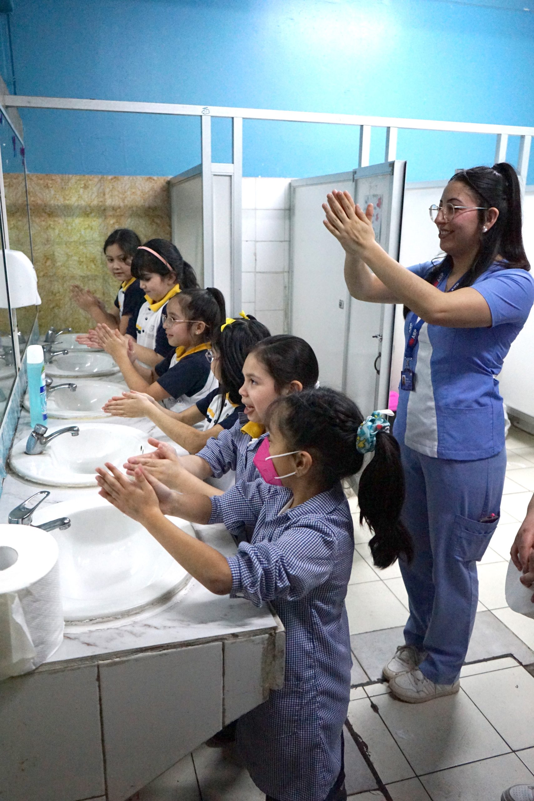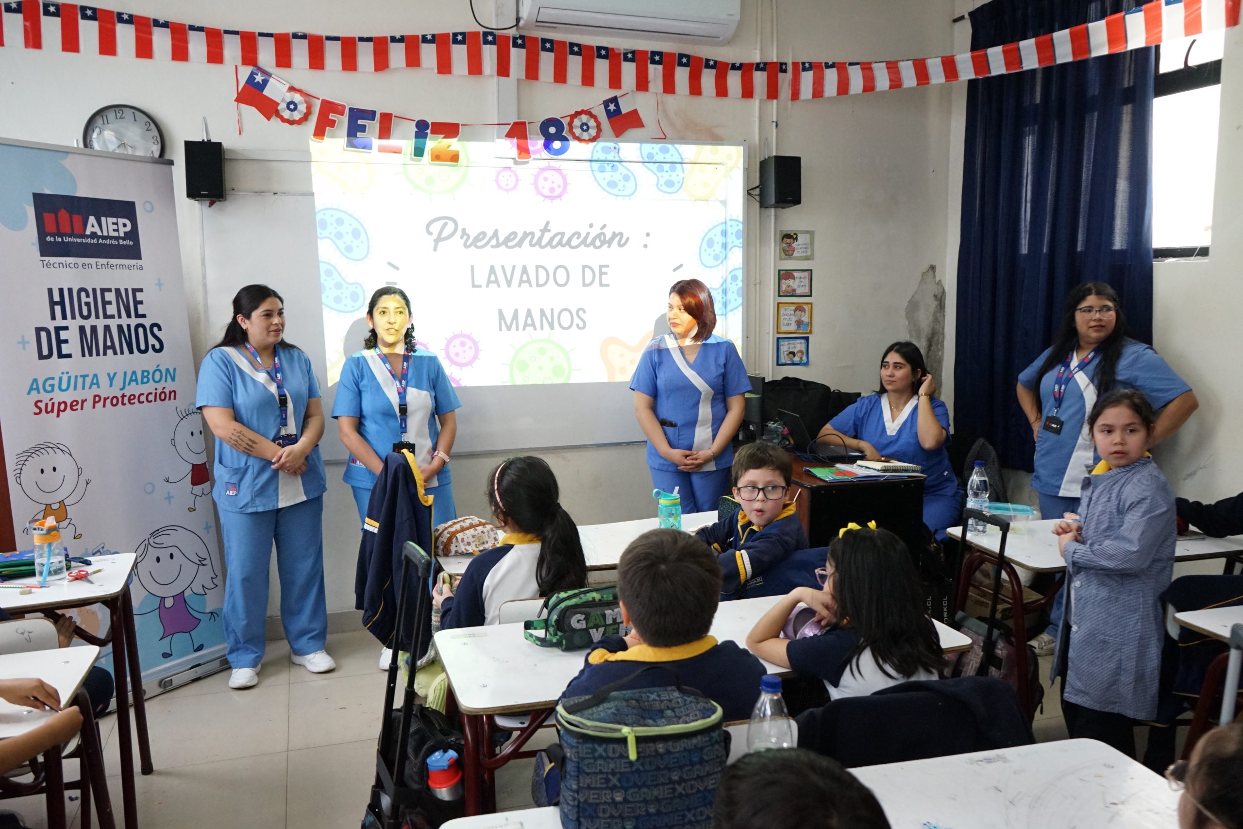 Junto al Instituto Profesional AIEP y la carrera de TNS en Enfermería enseñamos a los estudiantes de segundos básicos sobre la importancia del lavado de manos, con una actividad práctica cuyo principal objetivo fue educar sobre la prevención de patologías asociadas a la falta de higiene.