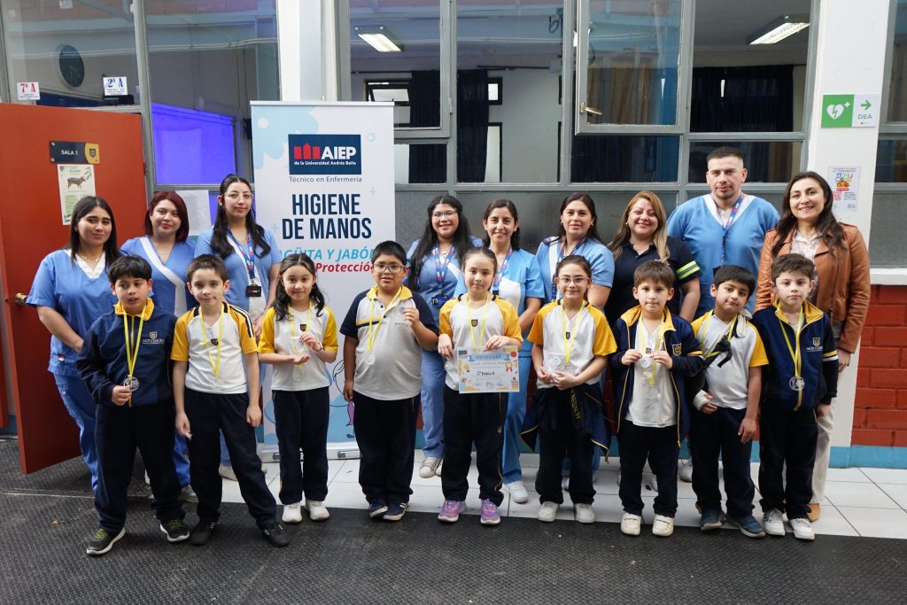 Junto al Instituto Profesional AIEP y la carrera de TNS en Enfermería enseñamos a los estudiantes de segundos básicos sobre la importancia del lavado de manos, con una actividad práctica cuyo principal objetivo fue educar sobre la prevención de patologías asociadas a la falta de higiene.