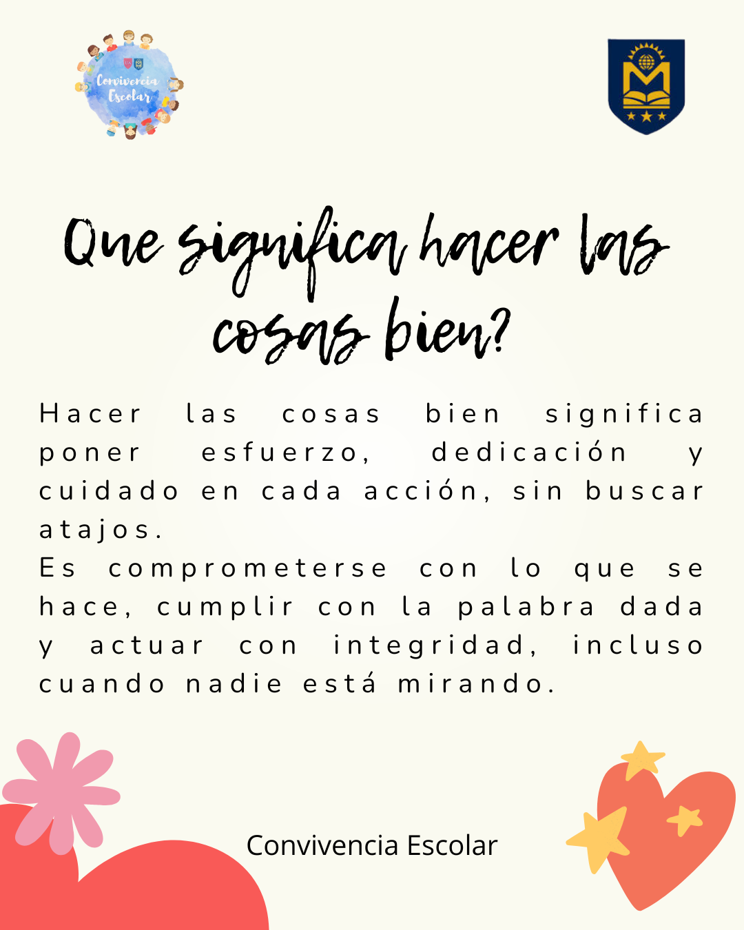 Hacer las cosas bien significa comprometerse con lo que uno hace, poner esfuerzo, dedicación y cuidado en cada acción. También implica cumplir con nuestra palabra y actuar con integridad, sin buscar atajos.