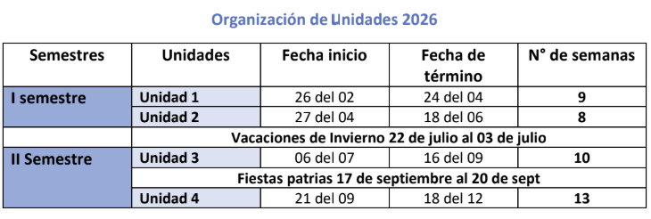 Asimismo, dejamos a continuación la Organización de Unidades para el I y II Semestre del Año Escolar 2026: