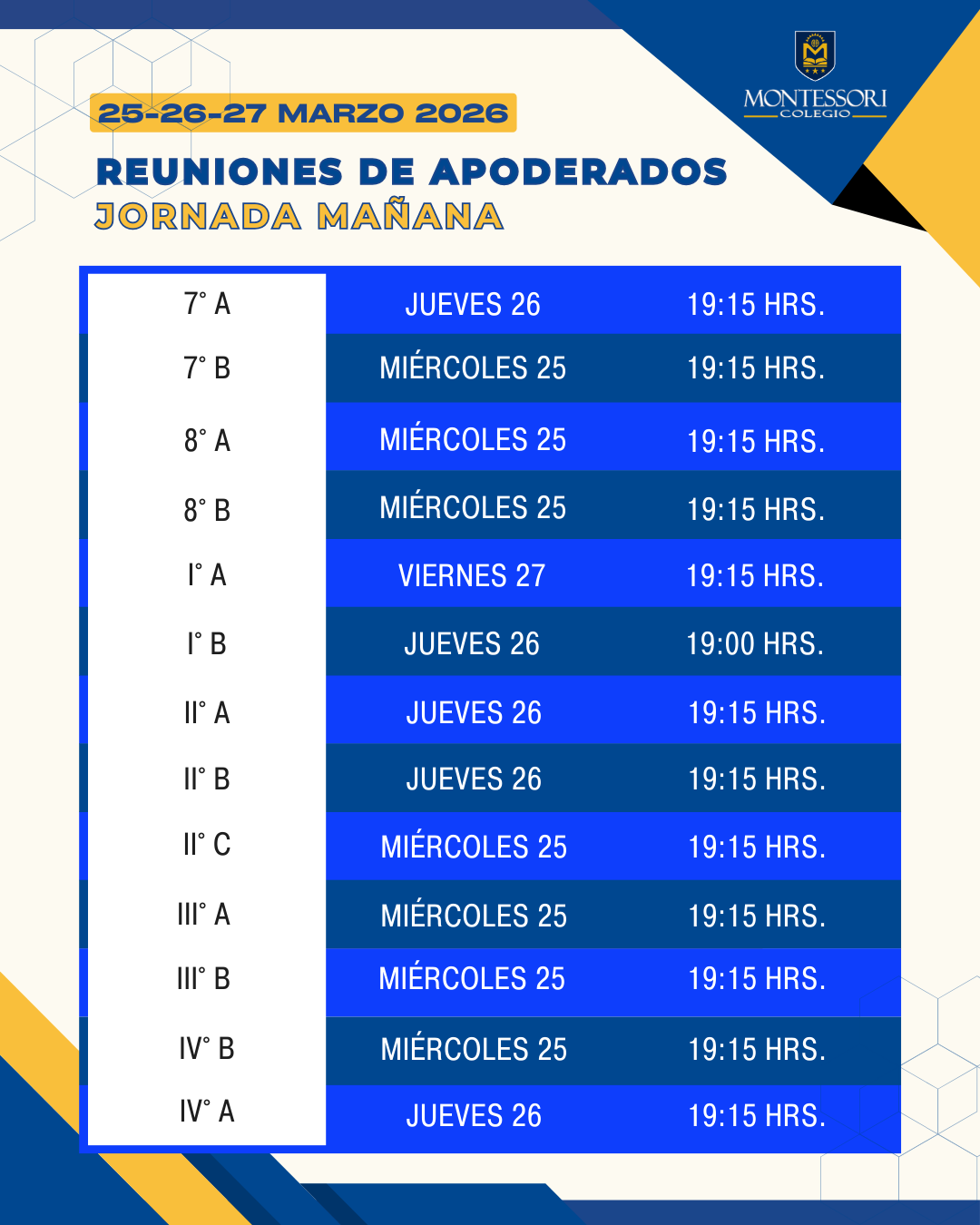 Les invitamos cordialmente a participar de nuestra primera Reunión de Apoderados de la Jornada Mañana dirigida a los padres de 7° Básico a IV° Medio, instancia que se llevará a cabo los días miércoles 25, jueves 26 y viernes 27 marzo.