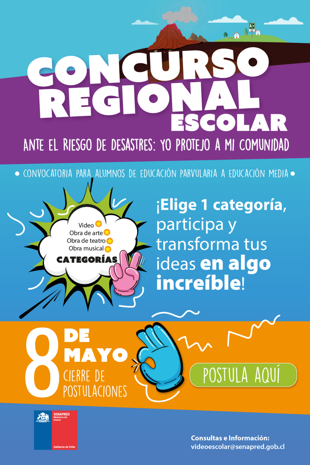 Las bases del concurso se encuentran disponibles en senapred.cl y araucania.mineduc.cl, con plazo de postulación hasta el 8 de mayo. Consultas al correo: videoescolar@senapred.gob.cl